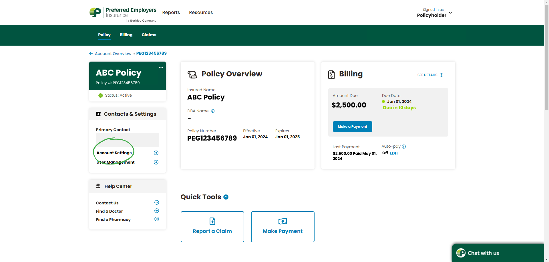 - From the Policy Overview page, click on ‘Account Settings’ in the left column of the page. Select the ‘Billing’ tab.